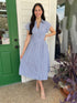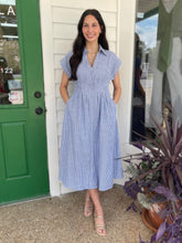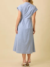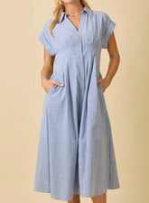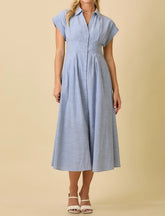 BLUE STRIPE BUTTON UP FRONT PLEATED SHIRT MIDI DRESS