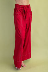 RED LINEN CONTRAST STITCHING WIDE LEG PANTS