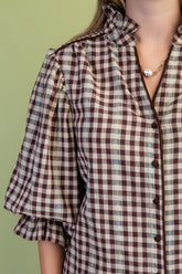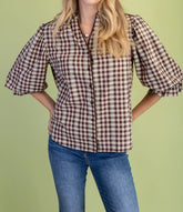 BROWN CHECKERED PRINT BUTTON DOWN GATHERED SLEEVE TOP