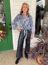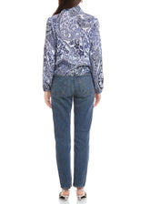 LIGHT & DARK BLUE PAISLEY PATCH CREPE PRINT SCARLET TIE-FRONT TOP