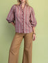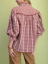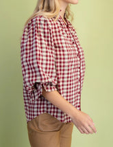 WINE CHECKERED PRINT BUTTON DOWN GATHERED SLEEVE TOP