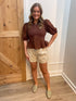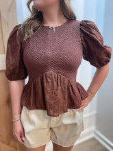 BROWN SMOCKED PEPLUM 3/4 PUFF SLEEVE ESRA TOP