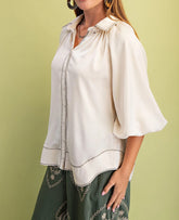 CREAM SATIN CONTRAST STITCH BALLOON SLEEVE BUTTON DOWN BLOUSE
