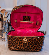 - TOP OF TRAIN CASE HAS A ZIPPERED POUCH AND ELASTIC HOLDERS FOR BRUSHES, LIPSTICKS, AND MORE.