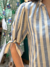 BLUE/CREAM STRIPED VNECK SHORT TIE SLEEVE TOP