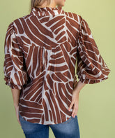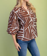 BURNT UMBER ABSTRACT PRINT BUTTON DOWN GATHERED SLEEVE TOP