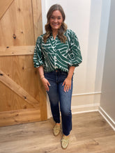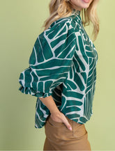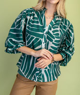 FOREST GREEN ABSTRACT PRINT BUTTON DOWN GATHERED SLEEVE TOP
