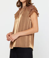 METALLIC GOLD TIE NECK RUFFLE SLEEVE TOP