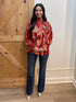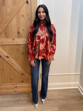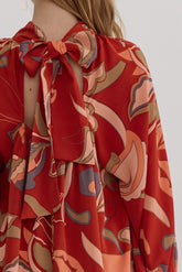 RUST PRINTED MOCK/TIE NECK FLOWY SLEEVE BLOUSE