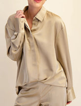 TAUPE LAPEL COLLAR SATIN LONG SLEEVE BUTTON UP TOP