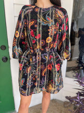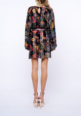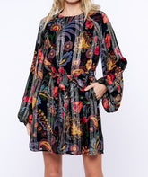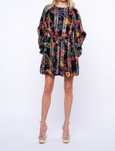 BLACK MULTI FLORAL PRINT METALLIC STRIPE LONG BUBBLE SLEEVE ODETTE MINI DRESS