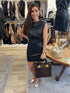 BLACK VEGAN LEATHER PADDED SHOULDER EMILY MINI DRESS