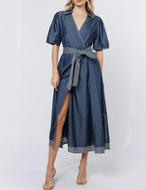 BLUE DENIM TRUE WRAP ROSANNA MIDI DRESS