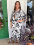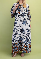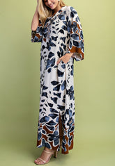 CHARCOAL MIX LEAF PRINT BOW NECK COLLAR LOUNGE MAXI DRESS