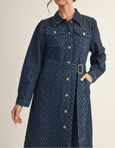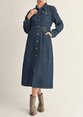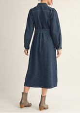 INDIGO DENIM GEOGRAPHIC PRINT BUTTON UP BELTED MIDI DRESS