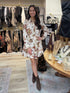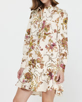 MAUVE MULTI FLORAL PRINT HALF BUTTON LONG SLEEVE FINE WALE CORDUROY MINI DRESS